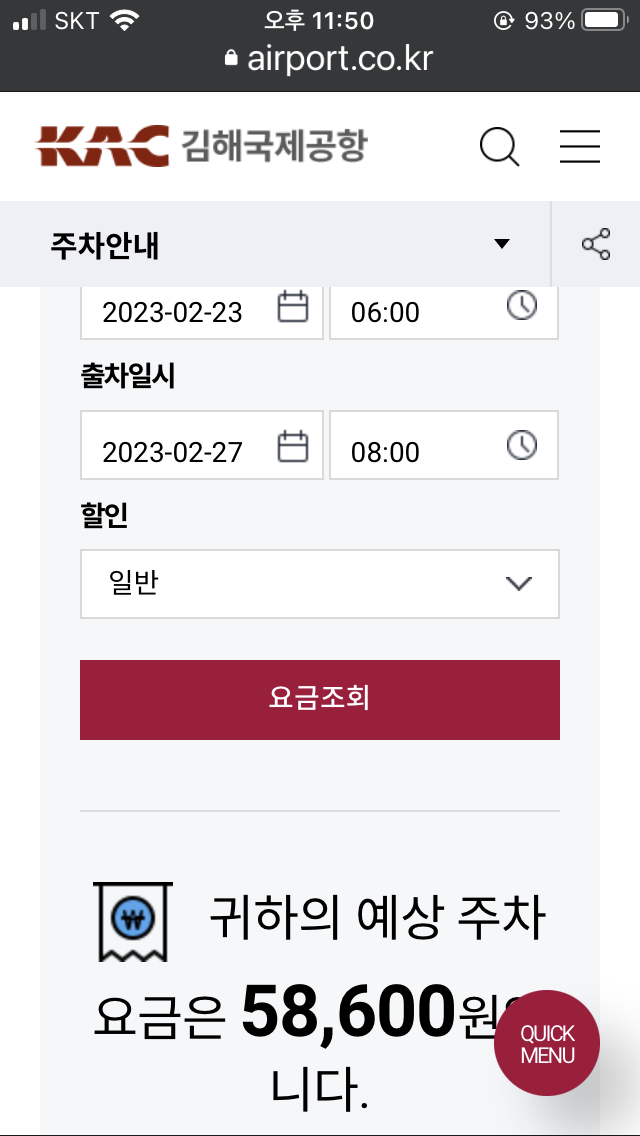 참고로 공항 내에 주차장을 이용하는 경우 주차 요금을 조회해 보니 3박 5일간 58,600원으로 나온다. 사설 주차장에서 셔틀을 타고 이동해야 하고, 귀국 시에 전화를 걸어 셔틀을 기다려야 한다는 점이 다소 불편할 수 있으나 사설 주차장들이 공항에 인접해 있어 불과 왕복 10분 이내의 짧은 이동으로 엄청난 주차 요금을 아낄 수 있다는 게 큰 장점이다.